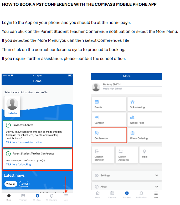 Compass will walk you through the booking process, but if you have any questions or issues, please don’t hesitate to contact the school office on 5635 2271.
