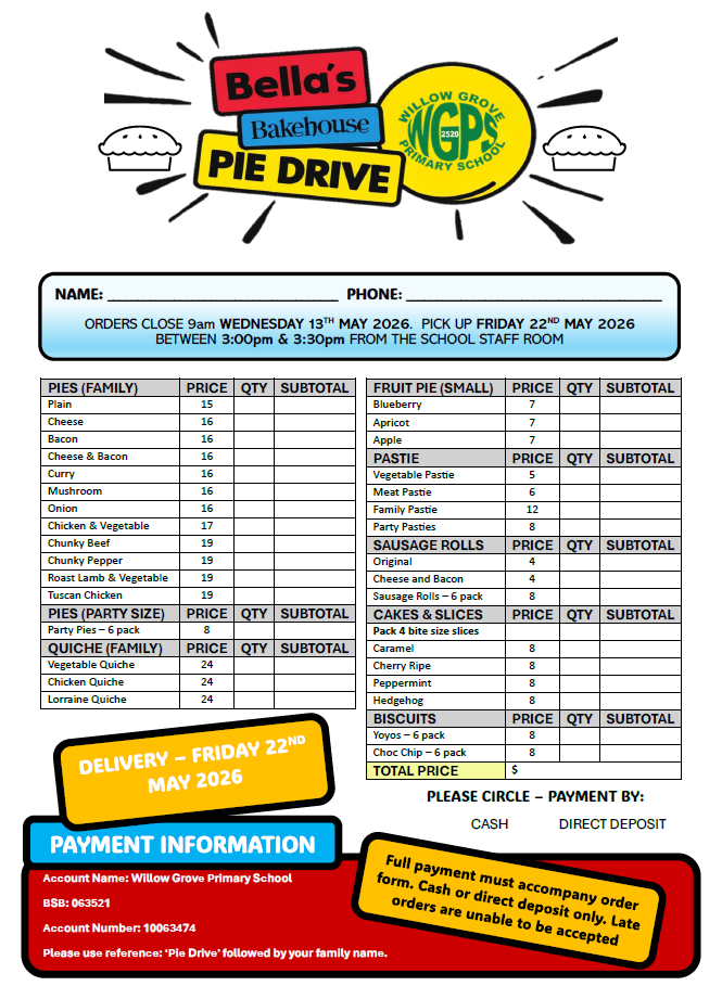 The Willow Grove Primary School Fundraising Committee are running a Pie Drive as their major fundraiser for Term 2.